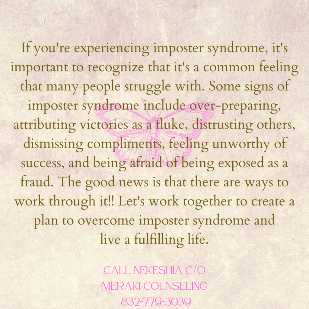 Some signs of imposter syndrome include over-preparing, attributing success to luck, distrusting others, dismissing positive feedback, feeling unworthy of success, and being afraid of being exposed as a fraud. To combat these feelings, try acknowledging your accomplishments and giving yourself credit for your hard work. It’s also helpful to talk to others about your feelings and seek support from friends, family, or a professional. Remember, you are capable and deserving of success!